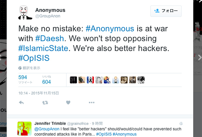 国だけでなく、地表最強のハッカー集団・Anonymous(アノニマス)も行動を行いました。先日、一人のAnonymousメンバーが宣戦の映像をYoutubeに公開しました。映像に『人類の力を団結しよう(unite humanity)』、『世の中の全てのアノニマスが貴様ら(ISIS)を追い込める(Anonymous from all over the world will hunt you down)』、『史上最大のハッキング攻撃を喰らいなさい(We will launch the bigget operation ever against you.)』の意思を表明し、それと同時に『フランス国民は貴様ら(ISIS)の思っていたより強い。今回のテロ事件を受けても折れることはない(The french people are stronger that you and will come out of this atrocity even stronger.)』とフランス国民を激励しました。