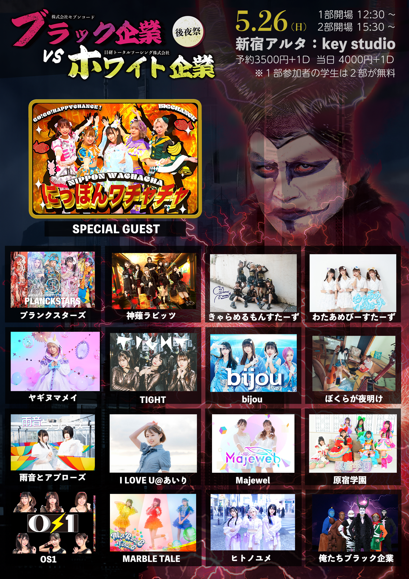 ブラック企業VSホワイト企業が終わった後は、アフターライブとしてガールズアイドル対バンライブイベントを行います!こちらは1部の会社説明会とは裏腹にびっくりするぐらいことが順調に進んでおります。僕の主催ライブは、名古屋のON AIR BATTLE、秋葉原のヨシダンデスライブに続き、3回目になります。正直にいいます。今回の出演者は激アツです!