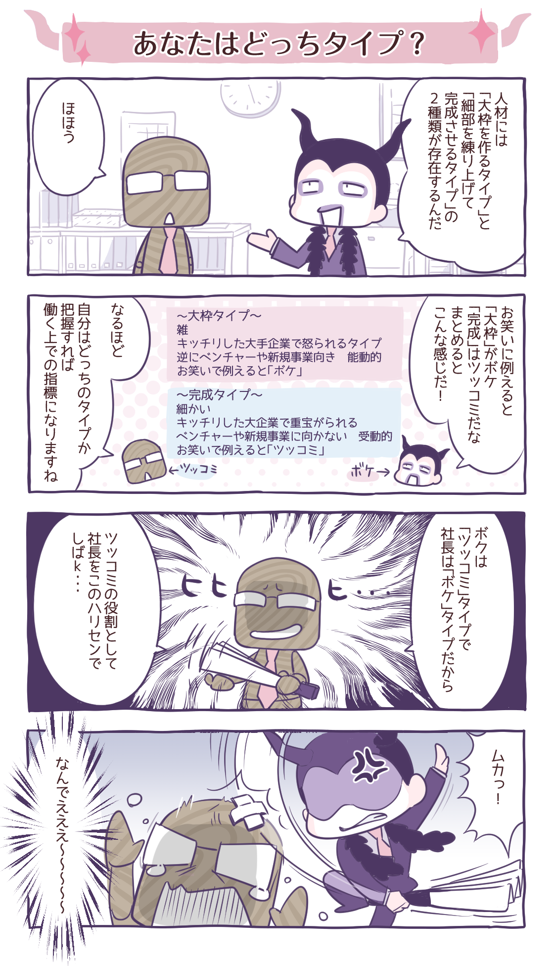 なので、中々チームでうまく結果が出ない時はボケとツッコミのように、大枠か細部か、どのタイプがチームにあるかを一度見極めるとよいかと思います。ボケしかいなかったら、苦手でも自分がツッコミに回る。