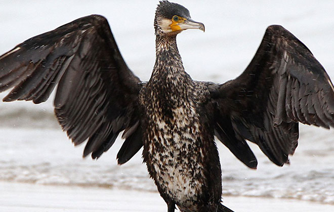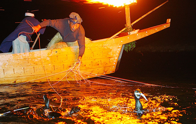 海鵜(ウミウ)たちがとってきたアユなどの川魚を吐き出させることで魚をとっています。