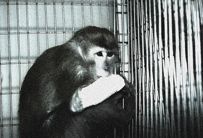 電流の強さは弱く、痛みは感じられますが怪我・死亡にはならない程度です。しかし猿がレバーを引いてくれるために、リンゴやバナナなどの果物を両方のレバーに刺しています。最初猿はルールが分からなくて、『なんで電撃が出るの?』、『えっ?これさっき電撃が出なかったっけ?』のよう迷っていました。痛みへの恐怖心、食欲、認知とズレる不思議感など……猿が電撃、果物と思考中数日過ごしました。しかし猿はイルカ、カラスに負けない高知能を持っている生物で、結局ルールは猿に解明されました。それ以来猿は電撃されることなく、バナナやリンゴを安心に美味しく食べられます。