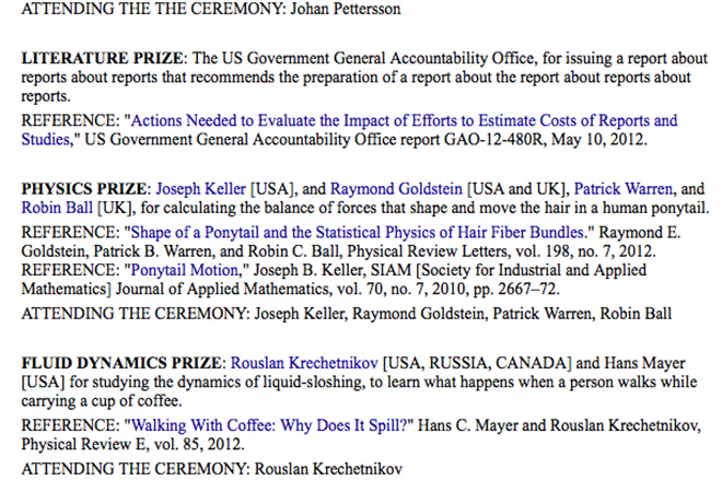 科学の面白さを一般人に伝えるために、イグノーベル賞(Ig Nobel Prize)が創設された。イグノーベル賞は人々に科学をもっと考えさせ・笑わせるコンセプトで運営していて、毎年世界中の面白い研究に賞を送っています。2012年に、ポニーテールに関する研究がイグノーベル・物理学賞をもらいました。Joseph Keller教授の研究チームは一つの質問ーー『なぜ人が走っている時、ポニーテールは動いている体と同じ方向に上下動くでなく、逆に左右に揺れるの?』ーーに対して考えていました。彼達は数学・物理学・工学などの角度からこの現象について研究したり計算したりして、揺れる頻度の観察・振り子エネルギーの変化から答えを発見しました。興味のある読者さんはぜひ彼たちの論文を見ましょう: