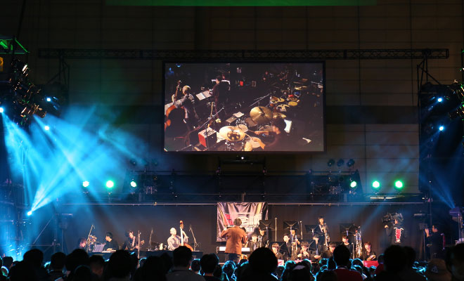 オーケストラがゲーム音楽を演奏するライブステージ。