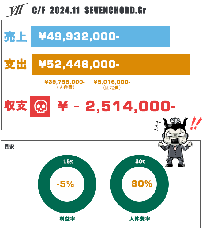 他にも決算に伴う社保とか税金とか諸々ありまして、今月の数値から借入率や手元資金の正確な算出は手間がかかるので来月に回します。なのて、今回はその欄は未集計という事で、すまん!