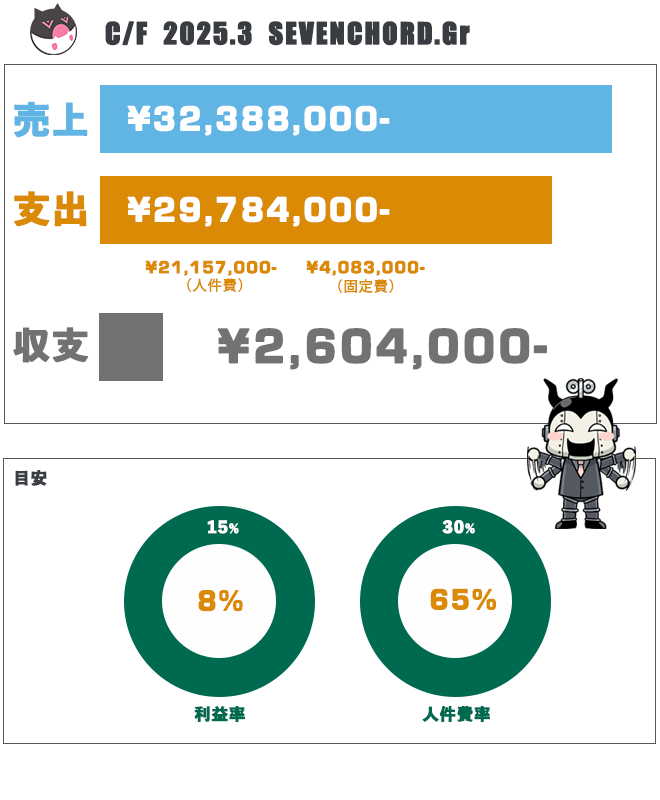 地味に支出を減らして、売り上げは成長軌道に乗りそうです。まだまだ、えろ勉のゲームやら漫画やらとコチラのコストはかかっておりますが、それを吸収して黒字になっているのは良い傾向です。とはいえ、弊社のコールセンター部門の年間契約の方が集中する月でもあったので、来月以降は、しばらく渋い月が続く見込みです。そこを打破してくれる若手リーダーのショッカー鈴木に期待しております。