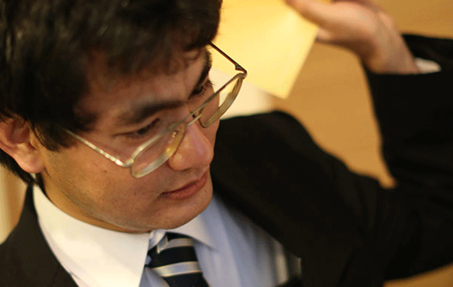 超絶シンプルなめがね(失礼)。少しサイズのあってなさそうなスーツ(失礼)。