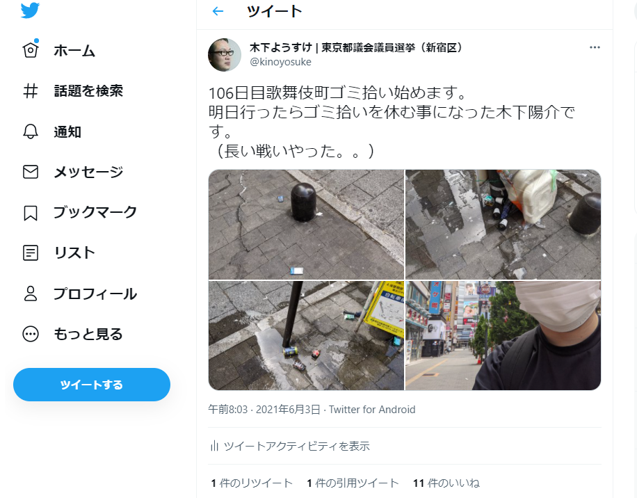 毎朝歌舞伎町のゴジラロードをゴミ拾いするのはきつかったですが、自信もつき選挙出るための心構えが出来ました。