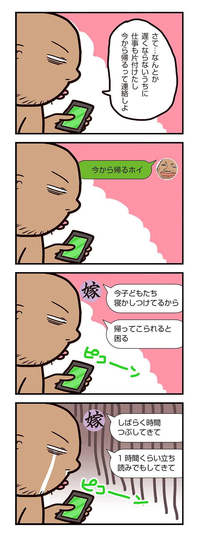 戦え!社畜パパ!4コマ 第4話 2017.08.30 BLOG 社畜の連載中 社畜パパ お疲れ様です。 長い業務の拘束時間、事あるごとに気になるのが家庭の状況、嫁さんの機嫌。 家族への連絡は大事ですね。今回はそんなお話です。 家族との時間が欲しい人は、是非とも社畜るへ業務代行のご連絡を! ブラック企業の告知 毎月980円でブラック企業の社内報が読めるのだ。 社内報では新規事業での人間関係のゴタゴタ。ゲーム開発での取引先とのドタバタ苦労話。新規事業の企画書などを公開。もちろん株式会社セブンコードの事業計画など! 時々、ブラック企業のオフィス屋上で入会者でBBQしたりしてるぜ (*゚▽゚*) ブラック企業社の社内報 Tweet Share Hatena Pocket RSS Pin it 投稿者: 緒方勇祐 BLOG, 社畜の連載中, 社畜パパ 2017年M-1の2回戦へ向けて!【ブラック企業の社内報vol.56】 前の記事 ブラック企業の社畜3年目。今の心境や社畜で良かったこと、後悔してること 次の記事