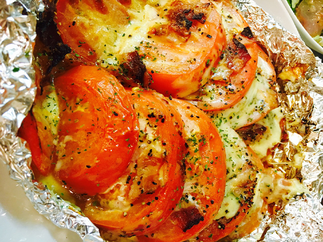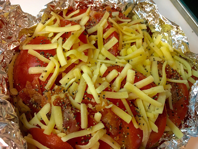 3.アルミホイルにトマトとベーコンとチーズをのせます。