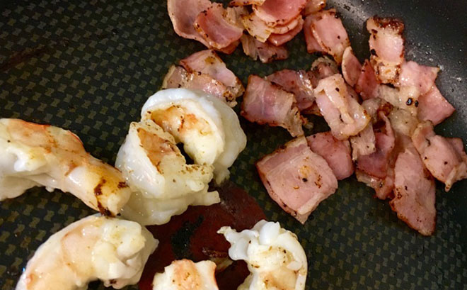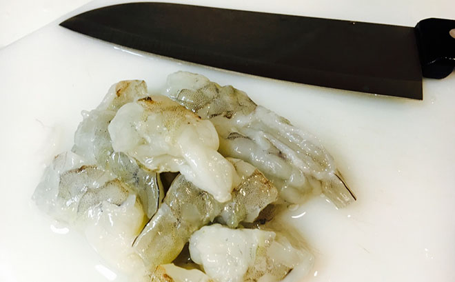 2.茹でてる間に、えびの処理をします。そして身を半分に切りました(一匹丸まるでも!)