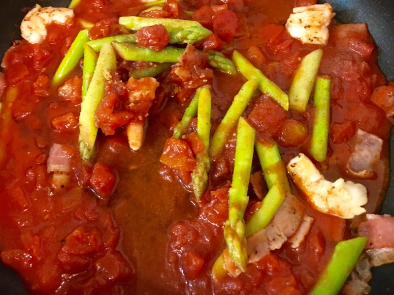 3.カットトマトを入れて、調味料(コンソメ・塩コショウ・昆布つゆ)を少々入れて軽く煮詰めます。