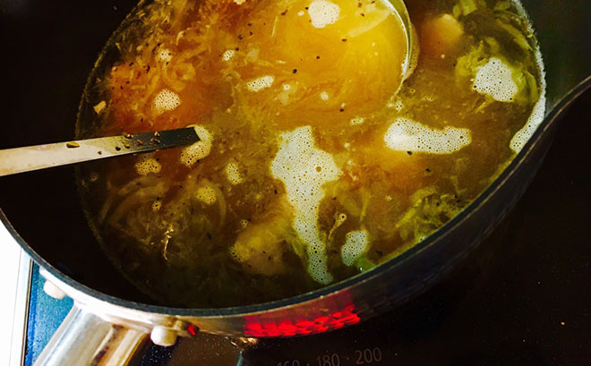 3.玉ねぎをしっかり炒めてベーコンも加えたら、具とお鍋に水を入れたらコンソメ多めと昆布つゆと胡椒を入れて見つめる。完成!!
