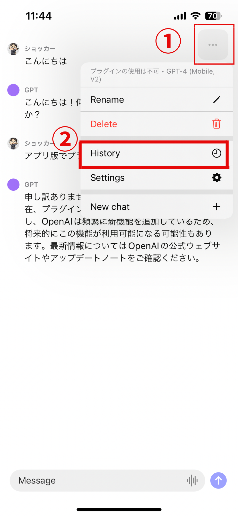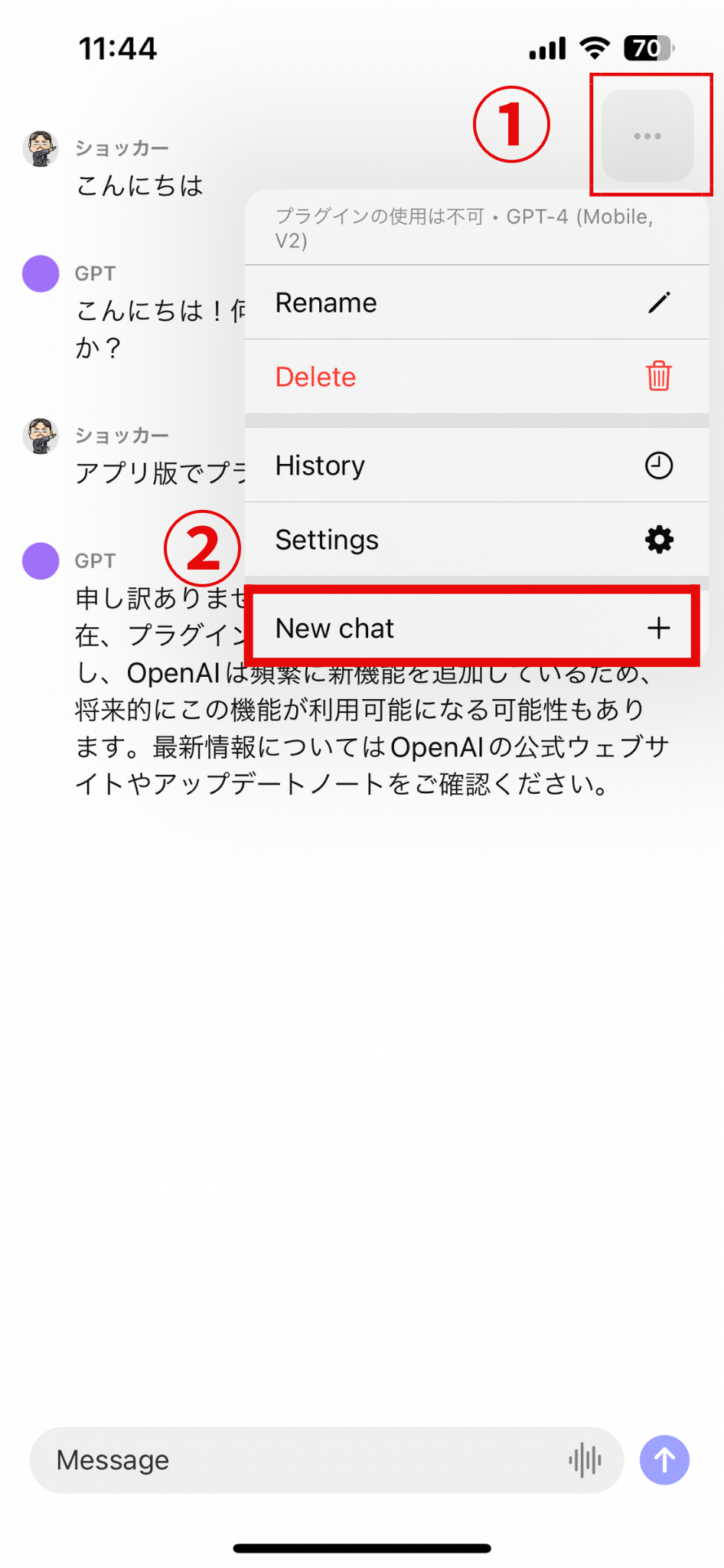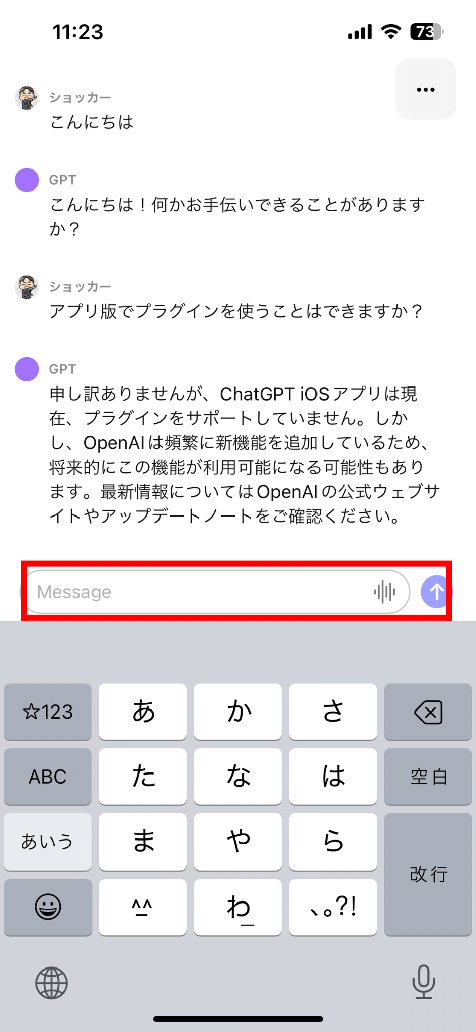 ログイン後、画面下部にある「Message」と書かれたテキストボックスをタップして、AIとの会話を開始します。質問やコメントを入力し、送信ボタンを押すと、ChatGPTが質問に対する回答や適切なコメントを提供します。