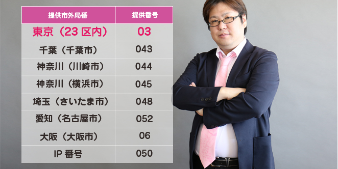 東京03から大阪06まで、お客様のご希望の地域の番号をお借りいただけます。