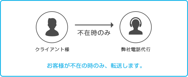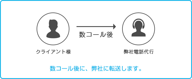 何コールかした後に弊社に転送されるよう設定していただくことで、オフィスにて受けられなかったお電話を弊社にてお受けすることが出来ます。