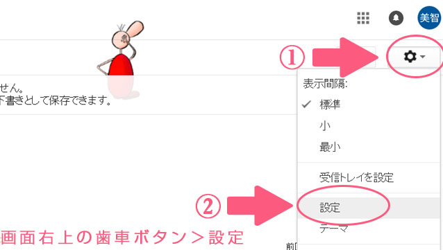 ①まず、Gmailの画面右上にある歯車ボタンをクリック。