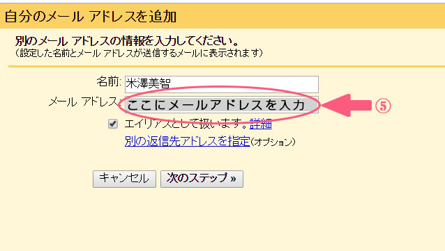 ⑤ここに送受信を行いたい任意のメールアドレスを入力し、次のステップへ。