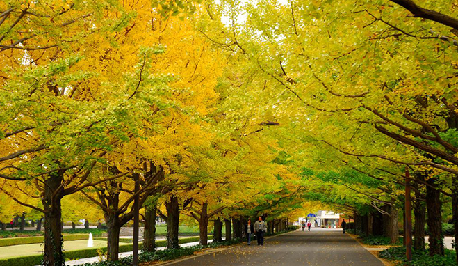 桜といちょうが道の両側に植わったため春にはピンク色に染まり、秋には黄金色に染まります。