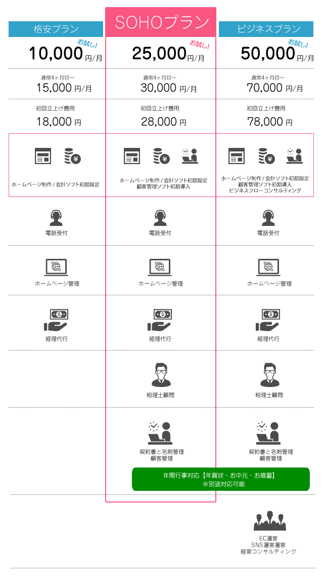※電話代行は月に20コール・経理代行は月30仕分けになります。それぞれの追加工数は一件に月180円かかります。100工数パックで1万円で受けたまります。