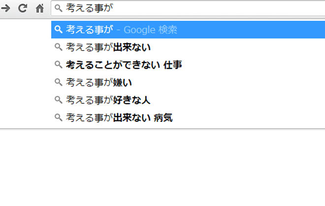 この記事を書くにあたり、ネタを見つけようとGoogleさんで「考える事が」と入力した所、