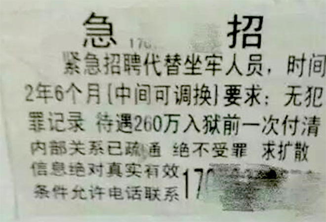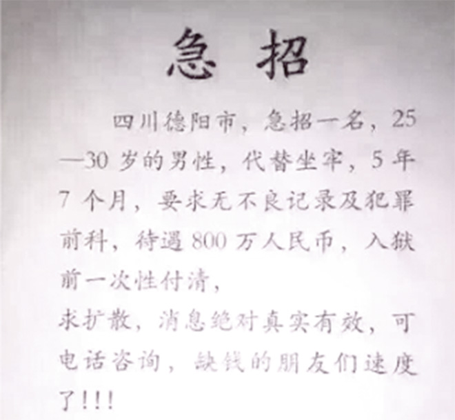 25~30歳の男性を募集しています。場所は四川徳陽市で、5年7ヶ月分を代わりに監獄に入ってくれる人(囚人代行)が欲しいです。犯罪前科がないことは必要条件で、800万人民元(1億5,000万円ぐらい)を監獄に入る前に全額支払います。本当に探しているので、ぜひシェアしてくだい。もちろん電話の問い合わせは大歓迎です。もしお金が足りない人がいれば、早く連絡してくださいね!